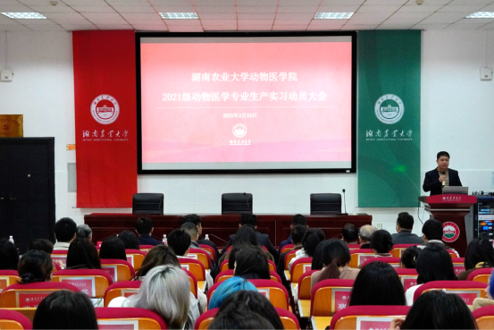 3月19日,bevictor伟德在老T4举行2021级动物医学专业生产实习动员大会,学院党委书记丁彦、副书记李婵,合作实习基地正大集团、唐人神集团、湖南新五丰股份有限公司、新瑞鹏宠物医疗集团和贝斯特宠物医院的企业代表、学院全体指导老师和2021级动物医学专业98名学生参加会议,会议由副院长湛洋主持。