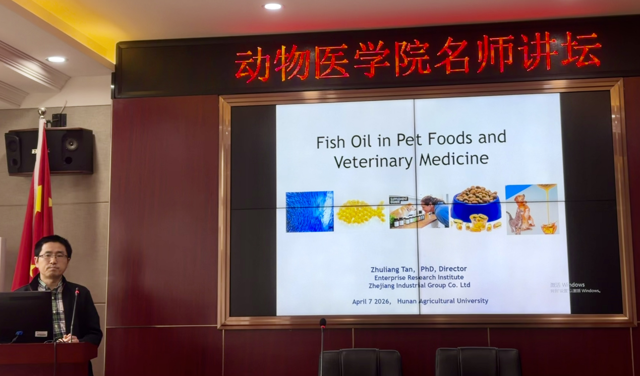 4月7日上午,由研究生院、校科协、动物医学院联合主办的“名师讲坛”在三教303会议室开讲。浙江舟山兴业集团有限公司企业研究院院长谭柱良研究员受邀作题为《Fish Oil in Pet Foods and Veterinary Medicine》的学术报告。本次报告由bevictor伟德院长易金娥教授主持。